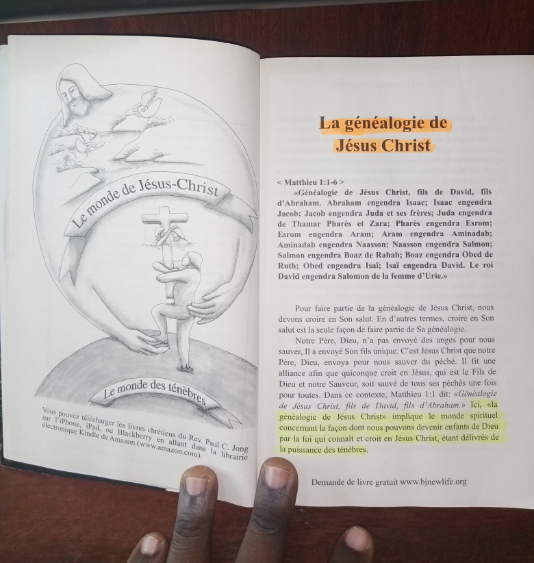 COMPTE RENDU DE LECTURE DU LIVRE 12, SERMONS SUR L'ÉVANGILE DE MATTHIEU (I)-QUAND UN CHRÉTIEN PEUT-IL AVOIR UNE CONVERSATION INTIME AVEC LE SEIGNEUR? Rév. Paul C. Jong PAR MA FOI, JE FAIS DESORMAIS PARTIE DE LA GENEALOGIE DE JESUS-CHRIST Ce livre me rappelle une fois de plus un épisode de ma vie avant d'être né de nouveau d'eau et d'Esprit. En croyant seulement en le sang de la Croix de Jésus comme preuve de mon salut, je n'arrivais pas à obtenir une foi semblable à celle d'Abraham. Même si j'essayais d'abandonner toute ma vie au Seigneur, il était evident que j'étais si éloigné de Lui. J'étais si désolé et misérable lorsque que je tombais encore et encore dans le péché. Suite à cela, j'avais résolu qu'il serait probablement important pour moi d'adopter le nom d'Abraham ou celui de David pour non seulement être aimé de Lui mais aussi vivre une vie sans commettre de péché. Cela n'a cependant pas été possible par la suite. Présentement, grâce à la méditation de ce livre, je suis si reconnaissant de faire partie de la généalogie de Jésus-Christ par ma foi en l'Évangile de l'eau et de L'Esprit. Même si je ne suis pas un descendant charnel d'Abraham ni n'ai un nom juif ou chrétien, en croyant de tout cœur que le Seigneur Lui-même est Dieu qui vint dans ce monde en chair humaine, fit réellement de moi Son enfant en me nettoyant de tous mes péchés par Son baptême et Son Sang. Étant né dans ce monde comme un paralytique, j'étais lié à commettre le péché même si je ne le souhaitais pas. Quelque soit les résolutions que j'ai prise en essayant de ne plus pécher, j'étais vaincu en croyant seulement au Sang de la Croix. Le Seigneur eut pitié de moi et me fit le rencontrer par l'Évangile de l'eau et de L'Esprit qu'Il accomplit dans ce monde il y a plus de 2000 ans. Alors je pu réellement être délivré de mes péchés une fois pour toutes. Par Sa Parole, Il a guéri mon ame en lavant tous mes péchés. LE VERITABLE JESUS EST VENU AVEC L'EAU ET LE SANG. Chers croyants, nous ne pouvons ni être sauvés ni rencontrer le Seigneur en fréquentant les grands bâtiments d'églises de ce monde qui prêchent seulement le Sang de la Croix et les œuvres vertueuses de l'humanité. Essayez-vous d'avoir une communion spirituelle avec le Seigneur en offrant toutes vos possessions matériels tout en observant la Loi? Si c'est le cas, vous êtes pris dans le piège de l'hypocrisie religieuse du christianisme. Le Seigneur dit en Jean 3:5: ''En vérité, en vérité, je te le dis, si un homme ne naît d'eau et d'Esprit, il ne peut entrer dans le royaume de Dieu.''. chers croyants qu'est-ce que ''l'eau'' et qu'est-ce que ''l'Esprit'' mentionnés ici? Croyez-vous que l'eau ici signifie que vous devez être baptisé d'eau dans une église ? Si vous croyez de la sorte, alors je vous invite à croire en l'évangile de l'eau et de L'Esprit. ''l'eau'' ici représente le baptême de Jésus par lequel Il prit sur Lui tous nos péchés par imposition des mains de Jean-Baptiste au Jourdain. L'eau ici signifie que Jésus qui est Dieu Lui-même a reçu tous nos péchés dans Son Corps en se faisant baptiser par Jean-Baptiste. Le rôle de l'eau est de laver. Alors, par le bapteme de Jésus au Jourdain, tous nos péchés ont été lavés une fois pour toutes. Nos péchés passés, présents e futurs ont été transférés dans le Corps de Jésus quand Il fut baptisé au Jourdain par Jean-Baptiste. C'est en croyant de tout coeur en Son Baptême et en Son sang que nous sommes sauvés en devenant de véritables enfants de Dieu. Si vous demeurez toujours pécheur alors que vous croyez en Jésus-Christ comme votre Sauveur, cela signifie que vous êtes devenus la proie de Satan le Diable. Satan le Diable vous séduis avec la Parole de Dieu en vous faisant croire en les miracles, les prodiges et les guérisons comme signe de la vraie foi. Cependant, le Seigneur déclare ouvertement que quiconque dit ''Seigneur Seigneur n'entrera pas forcément dans Son Royaume''. Satan séduit les chrétiens aujourd'hui au travers des faux prophètes avides d'argent, de pouvoir et de célébrité. Ce livre nous enseigne à repousser les tentations de Satan avec la Parole de Dieu et l'évangile de l'Eau et de l'Esprit. Il nous est impossible de repousser les tentations de Satan sans la foi en l'evangile de l'Eau et de l'Esprit. Satan se rie de vous lorsque vous essayez de le chasser avec le sang de la croix de Jésus seulement. Quiconque deumeure dans la foi du sang de la Croix comme preuve de son salut demeure sous l'emprise de Satan. Cependant, seulement ceux qui croient en l'eau (bapteme de Jésus), le Sang et l'Esprit triomphent de Satan.En tant qu'êtres humains, nous sommes liés à seulement aspirer au bien-être de notre chair. Meme en croyant en Jésus, nous sommes confrontés à des besoins tels que le manger, le boire et le vêtement. Mais, nous obtenons de nouveaux désirs en croyant en l'évangile de l'eau et de l'Esprit. En réalisant que ces désirs ne sont pas droits et bénéfiques spirituellement, nous pouvons les triompher en croyant en l'évangile de l'eau et de l'Esprit, la Parole de Dieu qui fit de nous Ses enfans. MES PRIERES SONT DESORMAIS EXAUCEES Ce livre m'a aidé à faire des prières correctes devant le Seigneur. J'avais l'habitude de parler en des sortes de langues démoniaques et restait les bras croisés en attente d'exaucement. Je ne pouvais pas prier de façon intelligible lorsque ma conscience était salie par les péchés que je commettais à chaqu'instant. C'est pourquoi j'affectionnais parler en ces langues démoniaques. Ainsi, je ne pouvais voir aucun exhaucement de mes prières se réalisé. J'étais si misérable alors que j'étais capable de parler en ces langues toute la nuit.La méditation de ce livre m'a donné la foi en la prière du Seigneur et ma permis de recevoir les bénédictions spirituelles. J'ai aussi compris pourquoi tant de chrétiens continuen
